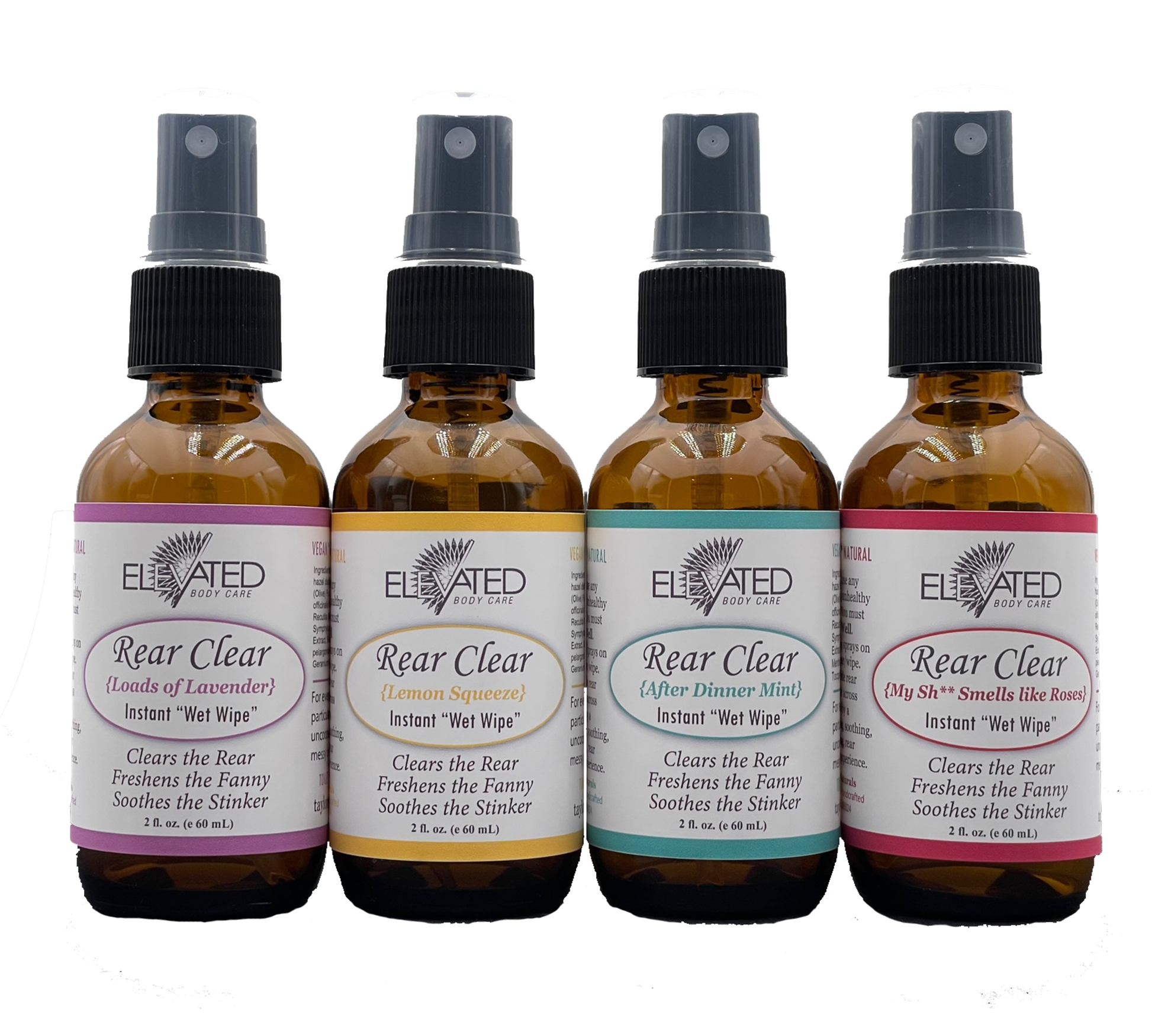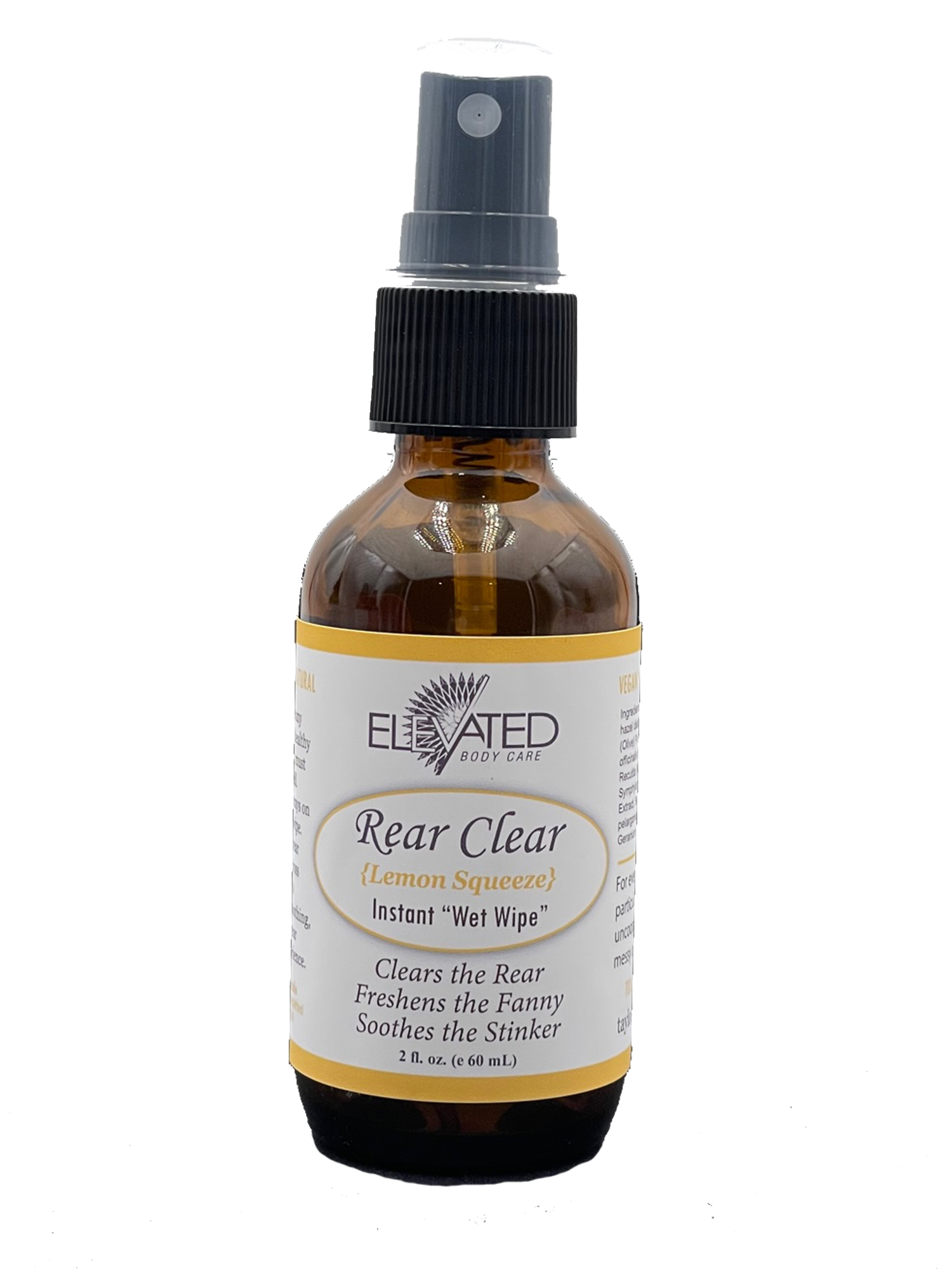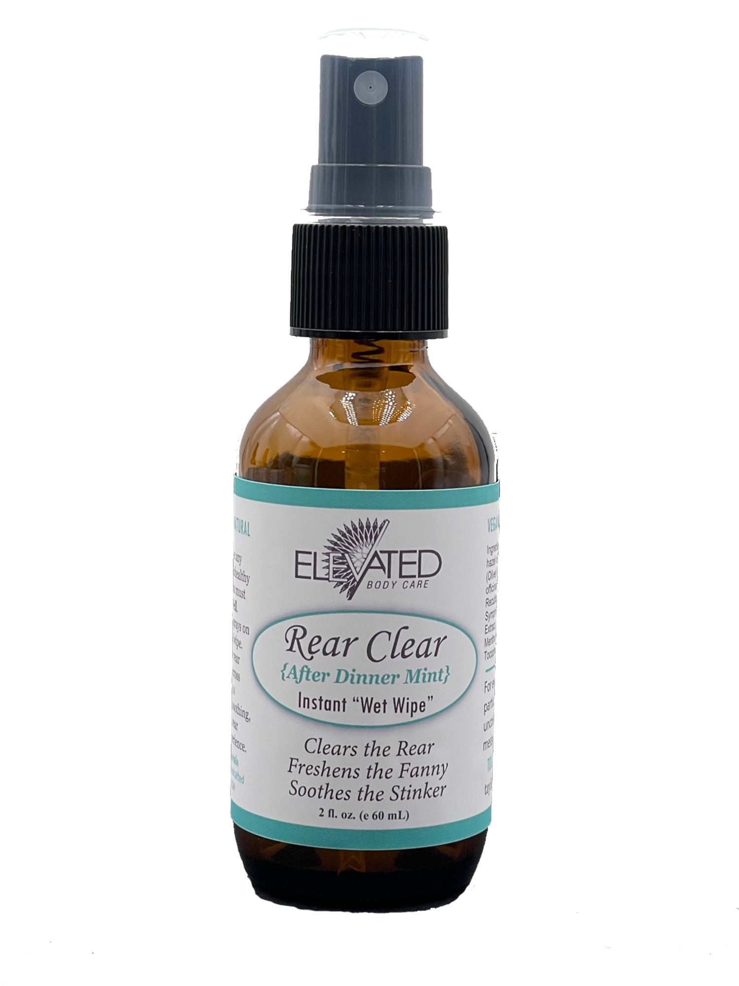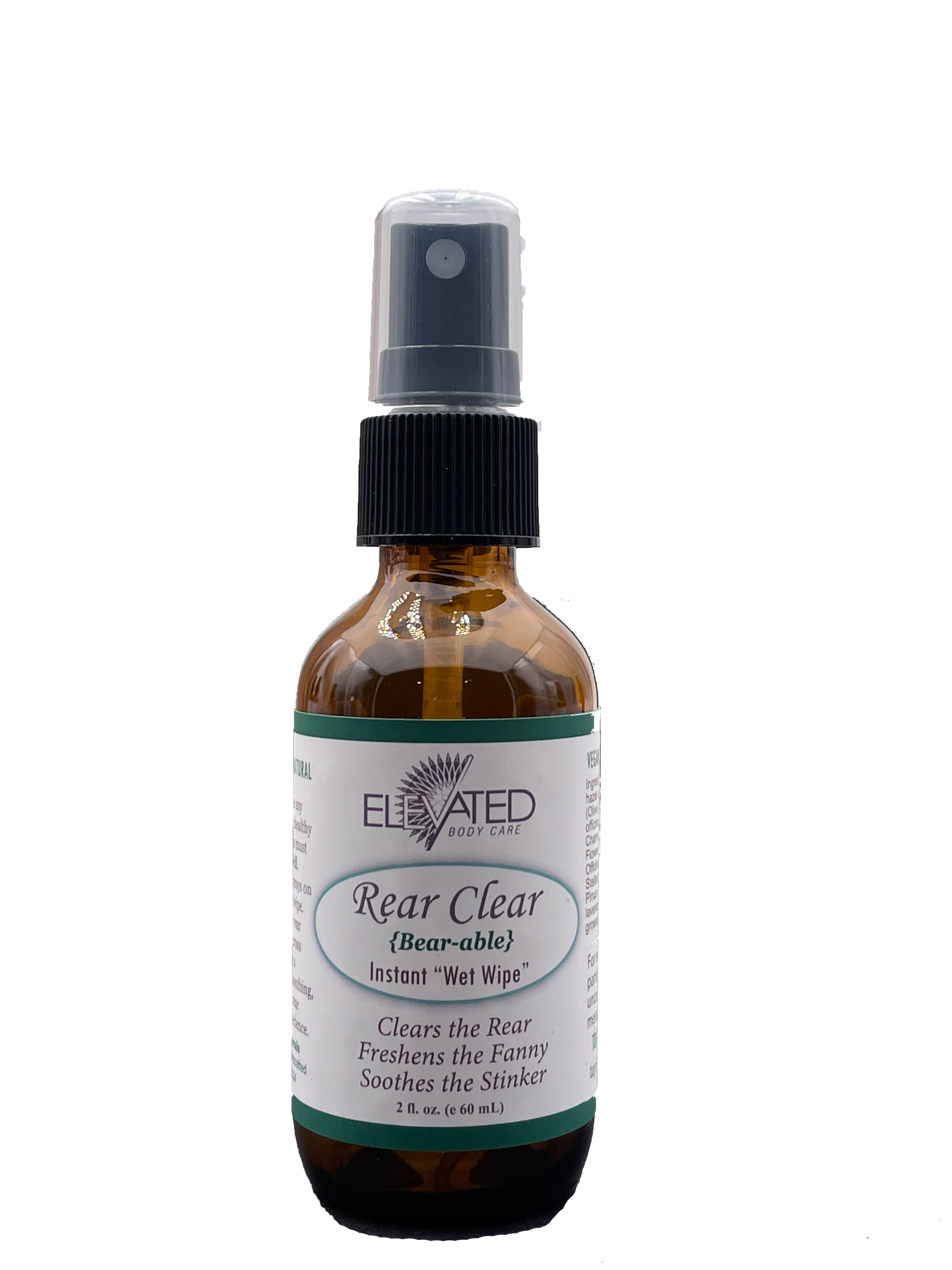 Rear Clear is designed for the "rear" and is a natural and non-polluting alternative to wet wipes. This is everyone's #2 Life Saver. Spray regular toilet paper or cloth wipe with Rear Clear for a more natural, eco-friendly, alternative to wet wipes. Not only is Elevated Rear Clear safe for plumbing systems – it is good for your behind. It keeps the ‘rear clear’, while it freshens, moisturizes, soothes, and even helps clear the (not so pleasant) #2 aromas. Rear Clear is perfect for travel, office and home use. Great for boaters and RV users with RV toilet tissue. A must have for campers and travelers so you can keep clean and fresh Ingredients: Witch hazel distillate (non-alcohol), organic extra virgin Olive Oil, Herbal Blend, pure, therapeutic essential oil blend (blend depends on scent), Vitamin E. Directions: SHAKE Well & give a couple sprays on toilet paper or cloth wipe. Gently glide rear clear wipe across rear & enjoy a freshening, soothing pampering, & clean experience.